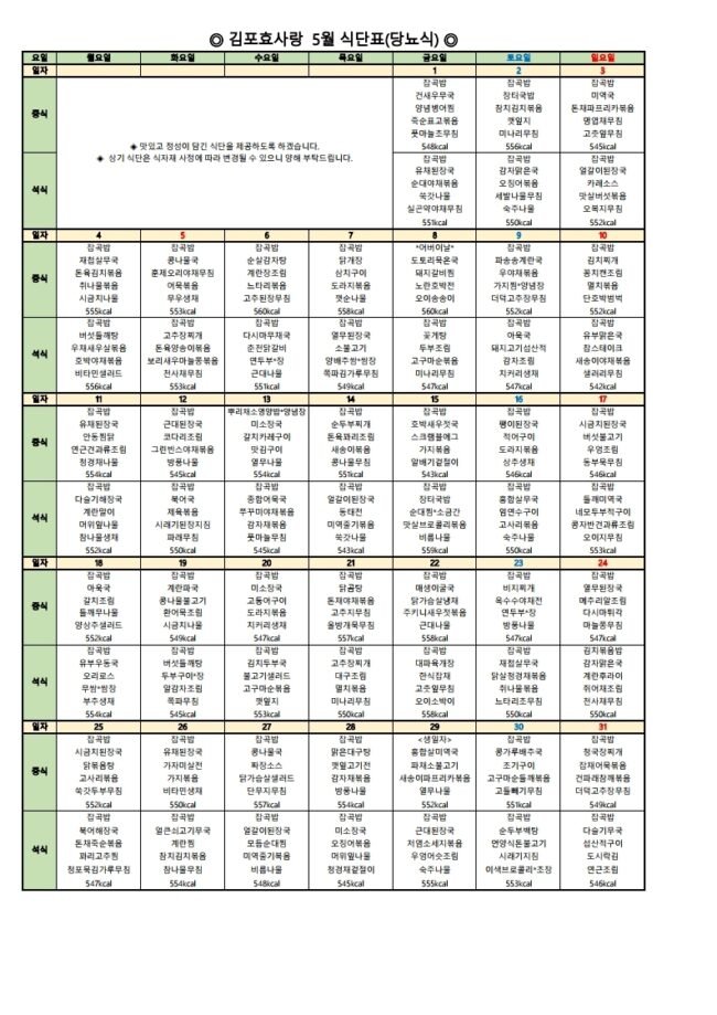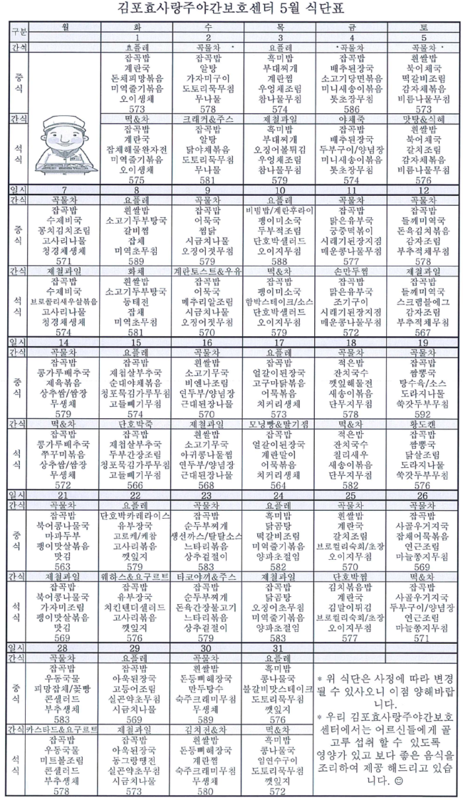 김포효사랑주야간보호센터 5월 식단 및 간식표입니다.
