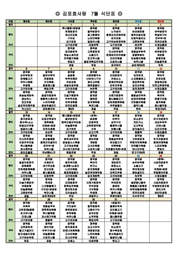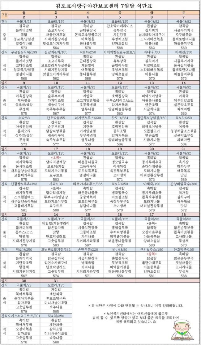 김포효사랑 주야간센터 7월 식단표 및 간식 식단입니다