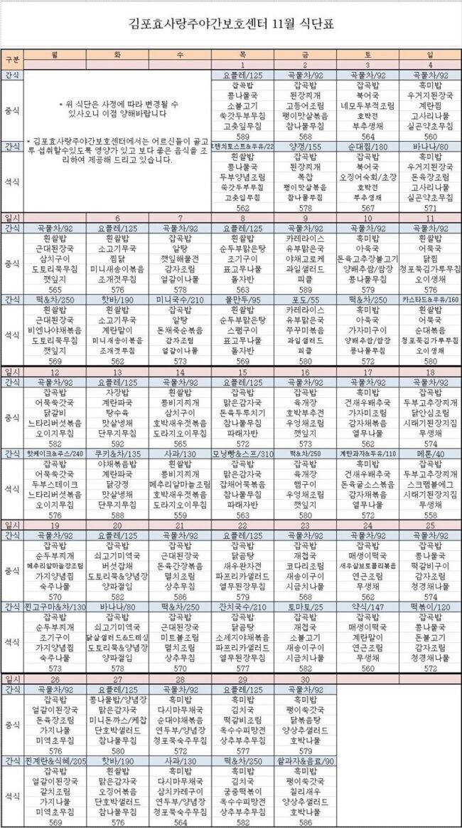 김포효사랑 주야간센터 11월 식단표 및 간식 식단입니다