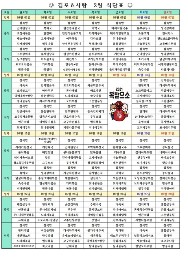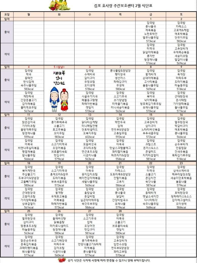 김포효사랑주야간센터 2월 식단표 및 간식 식단입니다.