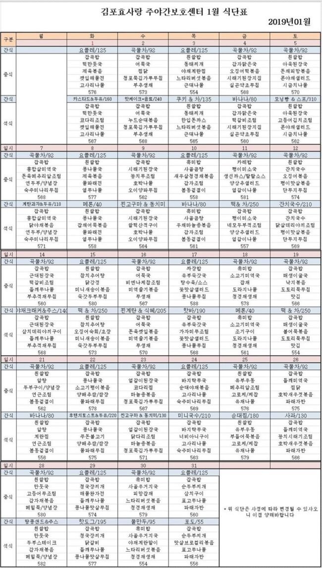 김포효사랑 주야간센터 1월 식단표 및 간식 식단입니다.