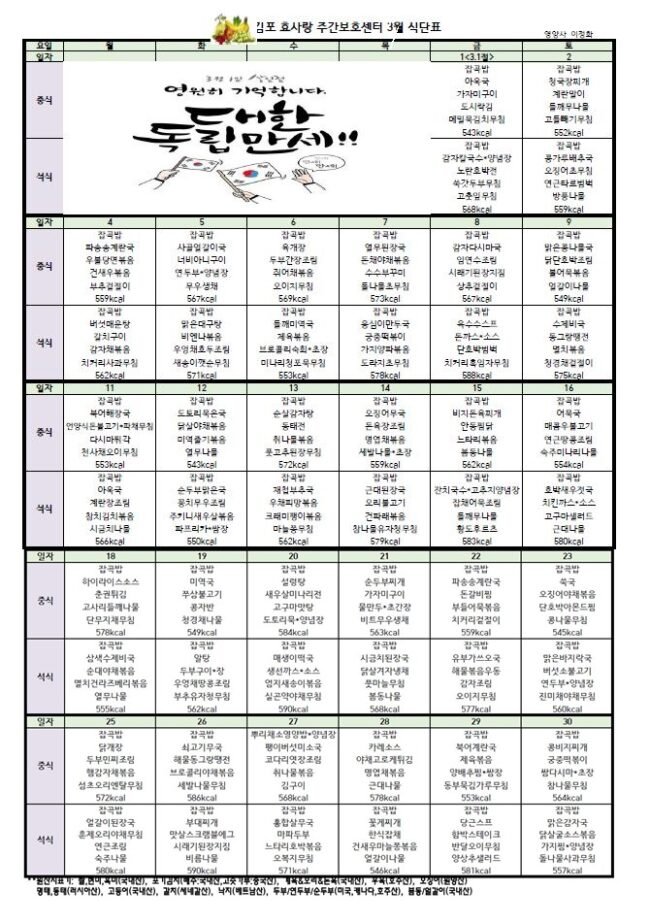김포효사랑주야간보호센터 3월 식단 및 간식표입니다.