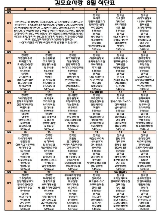 김포효사랑주야간센터 8월 식단표 및 간식 식단입니다.
