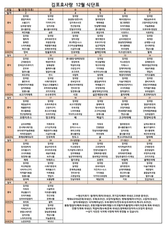 김포효사랑주야간센터 12월 식단표 및 간식 식단입니다.