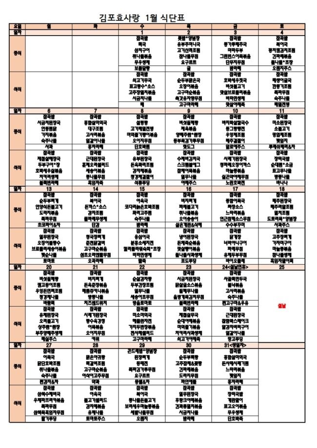 김포효사랑주야간센터 1월 식단표 및 간식 식단입니다.
