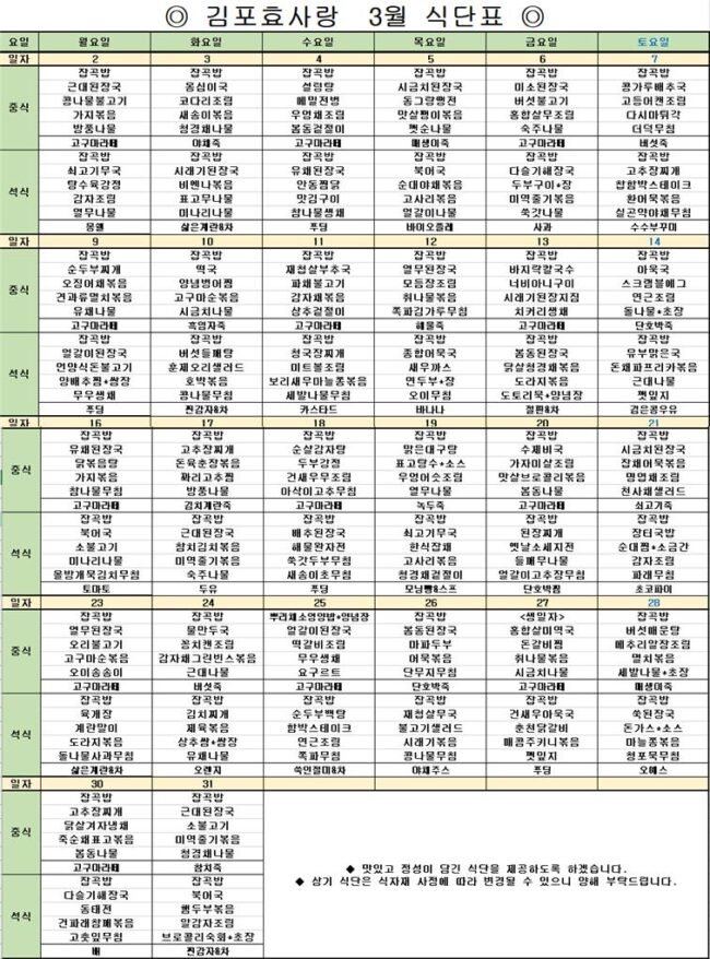 김포효사랑주야간센터 3월 식단표 및 간식 식단입니다.