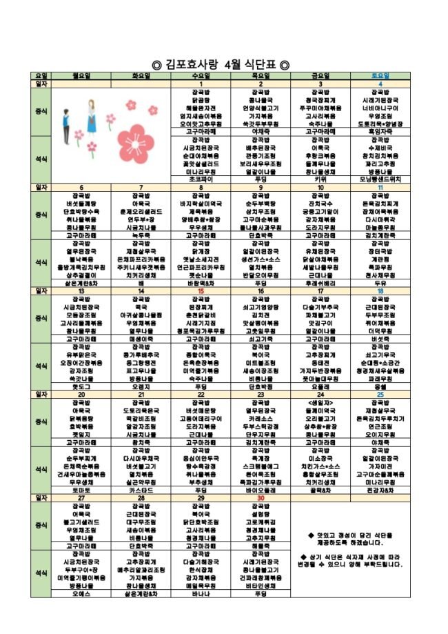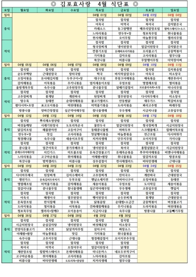 김포효사랑 주야간 보호센터 4월 식단표 입니다