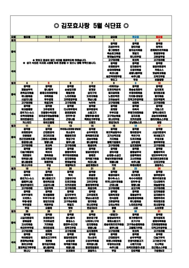 김포효사랑주야간센터 5월 식단표 및 간식 식단입니다.