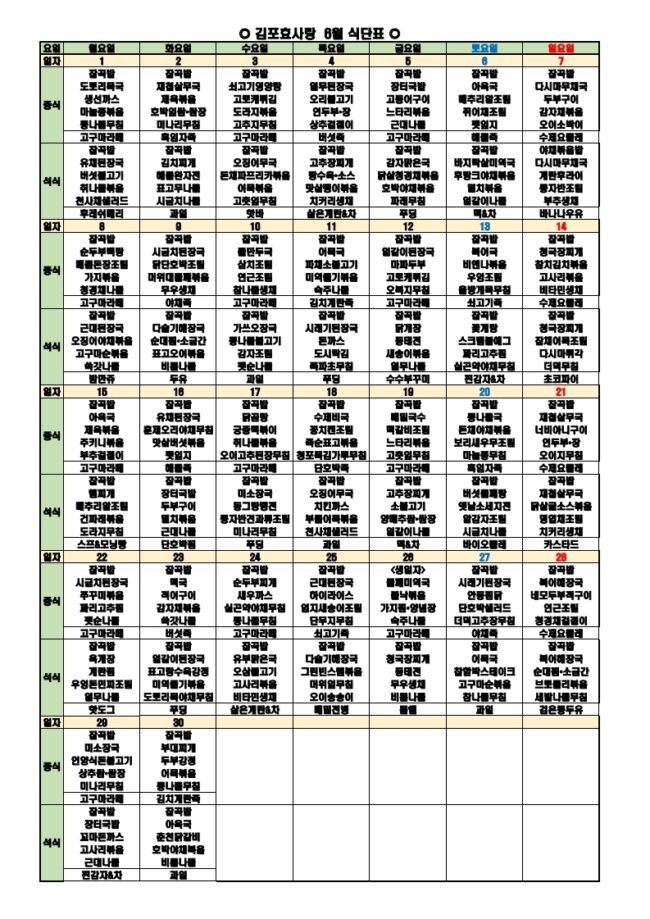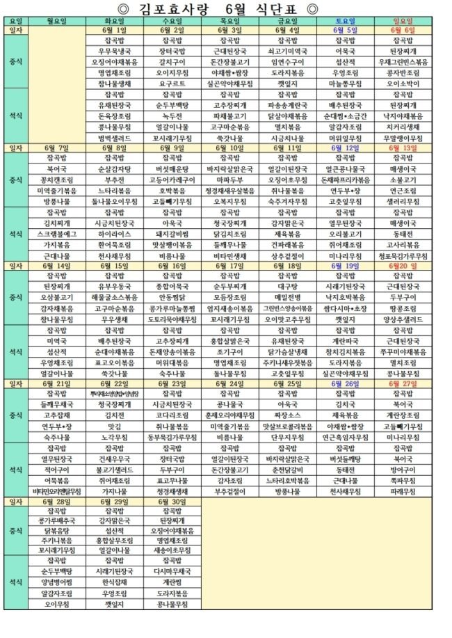 김포효사랑주야간센터 6월 식단표 및 간식 식단입니다.