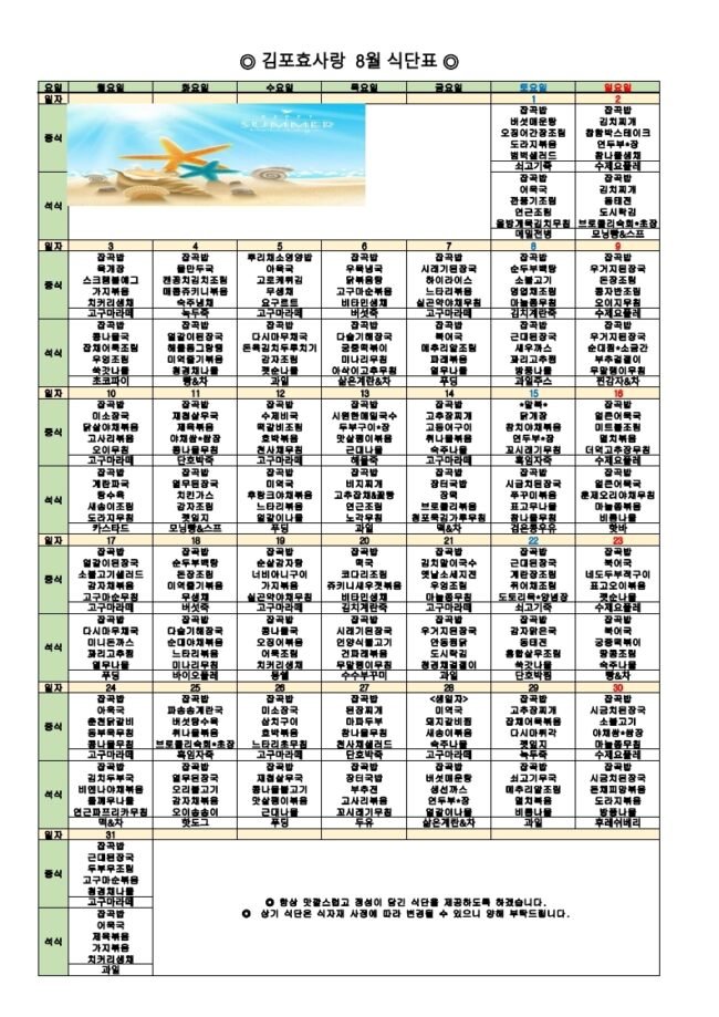 김포효사랑주야간보호센터 7월 식단 및 간식표입니다