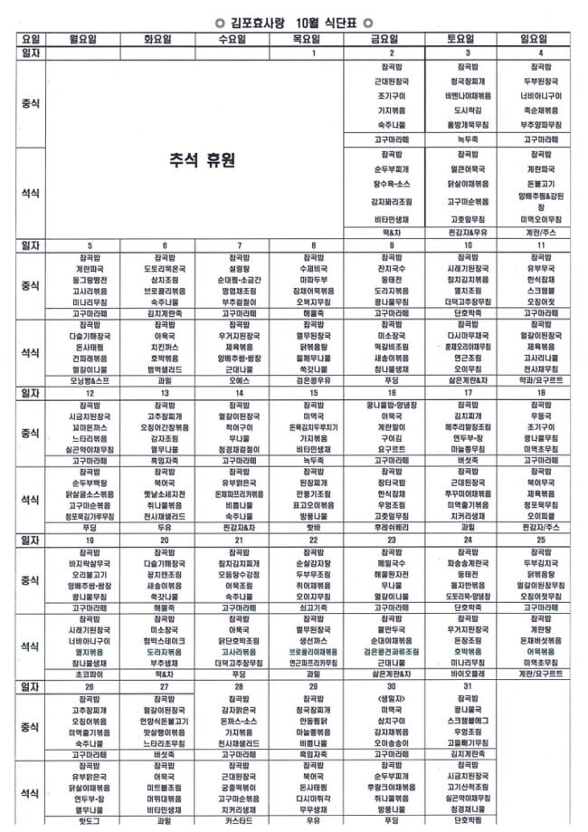 김포효사랑주야간보호센터 10월 식단 및 간식표입니다.