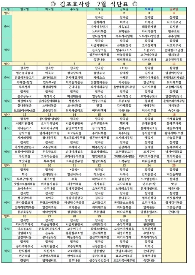 김포효사랑주야간센터 7월 식단표 및 간식 식단입니다.