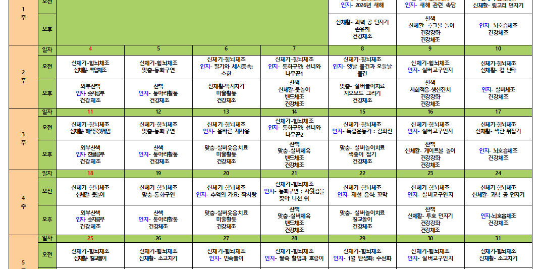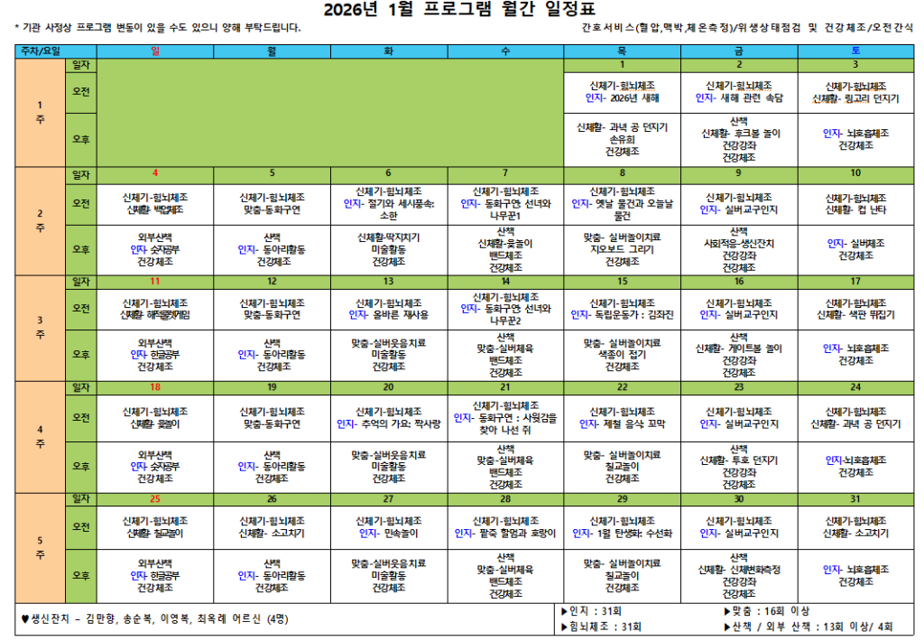 1월312026프로그램 일정표2026년 01월 31일Post navigationPreviousPrevious post:사회적응-생신잔치NextNext post:김포효사랑주야간보호센터 1월 식단 및 간식표입니다.Related Posts김포효사랑주야간보호센터 12월 월간프로그램계획입니다.2025년 12월 10일김포효사랑주야간보호센터 11월 월간프로그램계획입니다.2025년 11월 03일김포효사랑주야간보호센터 10월 월간프로그램계획입니다.2025년 10월 03일김포효사랑주야간보호센터 9월 월간프로그램계획입니다.2025년 09월 11일김포효사랑주야간보호센터 8월 월간프로그램계획입니다.2025년 08월 05일김포효사랑주야간보호센터 7월 월간프로그램계획입니다.2025년 07월 28일