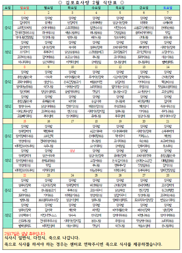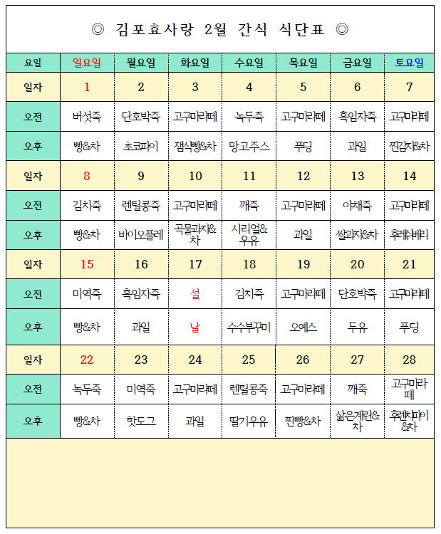 2월162026식단표2026년 02월 16일Post navigationPreviousPrevious post:김포효사랑주야간보호센터 1월 식단 및 간식표입니다NextNext post:김포효사랑주야간보호센터 2월 월간프로그램계획입니다.Related Posts김포효사랑주야간보호센터 1월 식단 및 간식표입니다2026년 02월 16일김포효사랑주야간보호센터 12월 식단 및 간식표입니다.2025년 12월 10일김포효사랑주야간보호센터 11월 식단 및 간식표입니다.2025년 11월 03일김포효사랑주야간보호센터 10월 식단 및 간식표입니다.2025년 10월 03일김포효사랑주야간보호센터 9월 식단 및 간식표입니다2025년 09월 11일김포효사랑주야간보호센터 8월 식단 및 간식표입니다2025년 08월 05일