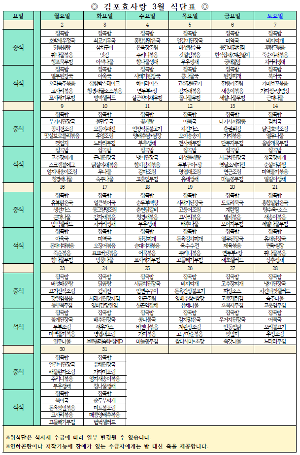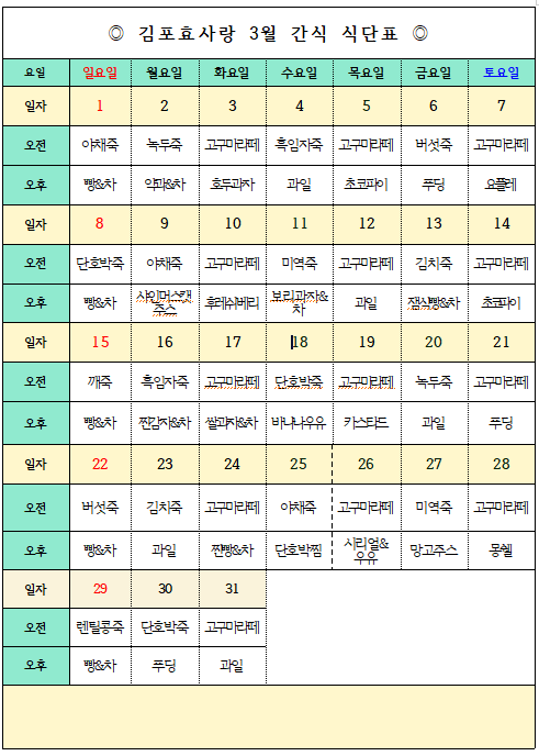 3월92026식단표 2026년 03월 09일Post navigationPreviousPrevious post:사회적응- 생신잔치NextNext post:김포효사랑주야간보호센터 3월 월간프로그램계획입니다.Related Posts김포효사랑주야간보호센터 2월 식단 및 간식표입니다2026년 02월 16일김포효사랑주야간보호센터 1월 식단 및 간식표입니다2026년 02월 16일김포효사랑주야간보호센터 12월 식단 및 간식표입니다.2025년 12월 10일김포효사랑주야간보호센터 11월 식단 및 간식표입니다.2025년 11월 03일김포효사랑주야간보호센터 10월 식단 및 간식표입니다.2025년 10월 03일김포효사랑주야간보호센터 9월 식단 및 간식표입니다2025년 09월 11일