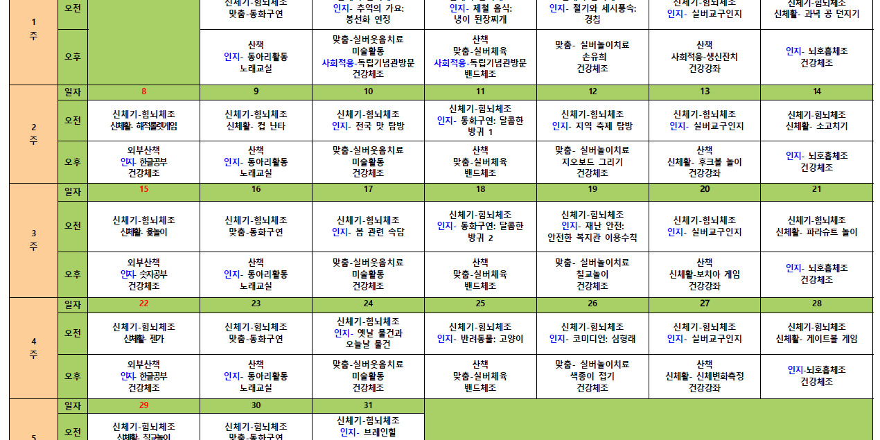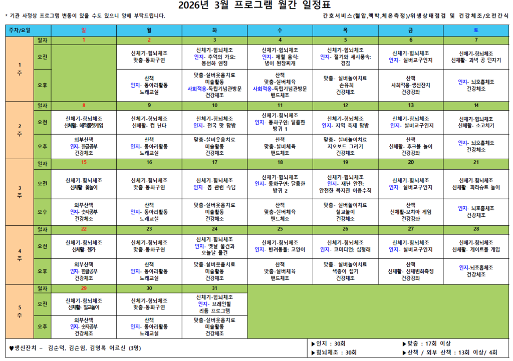 3월92026프로그램 일정표 2026년 03월 09일Post navigationPreviousPrevious post:김포효사랑주야간보호센터 3월 식단 및 간식표입니다Related Posts김포효사랑주야간보호센터 2월 월간프로그램계획입니다.2026년 02월 16일김포효사랑주야간보호센터 1월 월간프로그램계획입니다.2026년 01월 31일김포효사랑주야간보호센터 12월 월간프로그램계획입니다.2025년 12월 10일김포효사랑주야간보호센터 11월 월간프로그램계획입니다.2025년 11월 03일김포효사랑주야간보호센터 10월 월간프로그램계획입니다.2025년 10월 03일김포효사랑주야간보호센터 9월 월간프로그램계획입니다.2025년 09월 11일