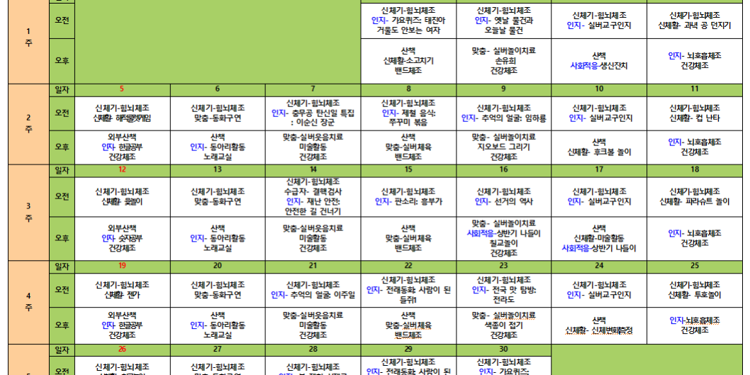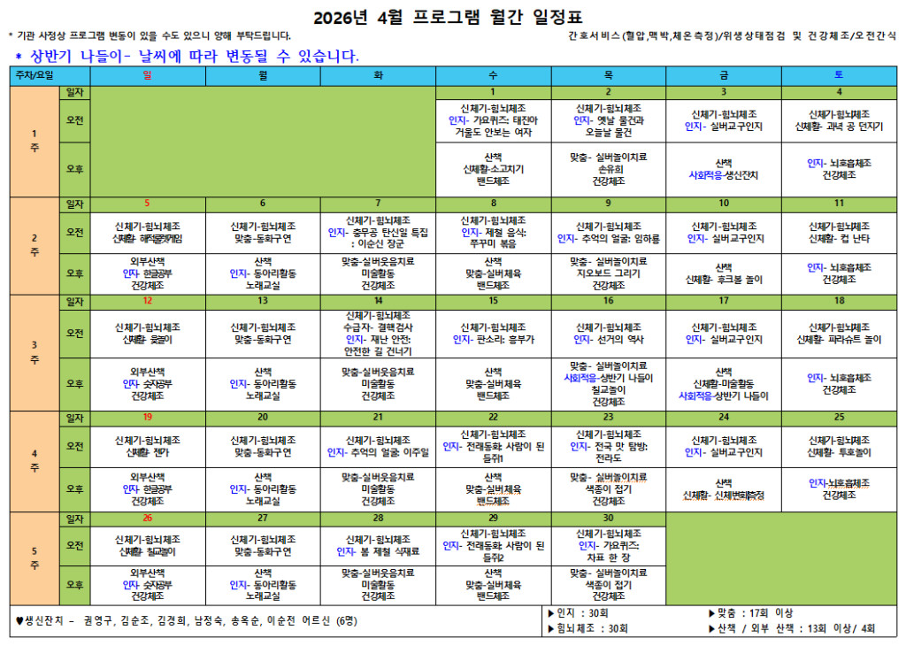 4월32026프로그램 일정표 2026년 04월 03일Post navigationPreviousPrevious post:사회적응- 생신잔치NextNext post:김포효사랑주야간보호센터 4월 식단 및 간식표입니다Related Posts김포효사랑주야간보호센터 3월 월간프로그램계획입니다.2026년 03월 09일김포효사랑주야간보호센터 2월 월간프로그램계획입니다.2026년 02월 16일김포효사랑주야간보호센터 1월 월간프로그램계획입니다.2026년 01월 31일김포효사랑주야간보호센터 12월 월간프로그램계획입니다.2025년 12월 10일김포효사랑주야간보호센터 11월 월간프로그램계획입니다.2025년 11월 03일김포효사랑주야간보호센터 10월 월간프로그램계획입니다.2025년 10월 03일