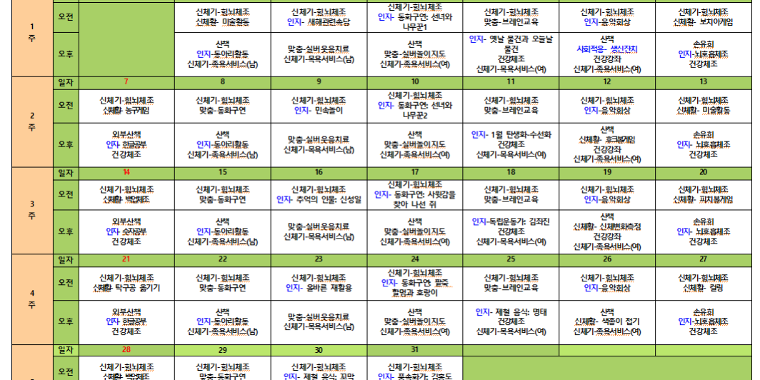 1월82024프로그램 일정표2024년 01월 08일Post navigationPreviousPrevious post:사회적응-생신잔치NextNext post:김포효사랑 주야간센터 1월 식단표 및 간식 식단입니다.Related Posts김포효사랑주야간보호센터 10월 월간프로그램계획입니다.2025년 10월 03일김포효사랑주야간보호센터 9월 월간프로그램계획입니다.2025년 09월 11일김포효사랑주야간보호센터 8월 월간프로그램계획입니다.2025년 08월 05일김포효사랑주야간보호센터 7월 월간프로그램계획입니다.2025년 07월 28일김포효사랑주야간보호 6월간 프로그램계획입니다.2025년 06월 06일김포효사랑주야간보호 5월간 프로그램계획입니다.2025년 05월 22일