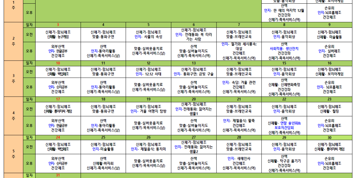 12월52023프로그램 일정표2023년 12월 05일Post navigationPreviousPrevious post:김포효사랑 주야간센터 12월 식단표 및 간식 식단입니다.NextNext post:사회적응-생신잔치Related Posts김포효사랑주야간보호센터 10월 월간프로그램계획입니다.2025년 10월 03일김포효사랑주야간보호센터 9월 월간프로그램계획입니다.2025년 09월 11일김포효사랑주야간보호센터 8월 월간프로그램계획입니다.2025년 08월 05일김포효사랑주야간보호센터 7월 월간프로그램계획입니다.2025년 07월 28일김포효사랑주야간보호 6월간 프로그램계획입니다.2025년 06월 06일김포효사랑주야간보호 5월간 프로그램계획입니다.2025년 05월 22일
