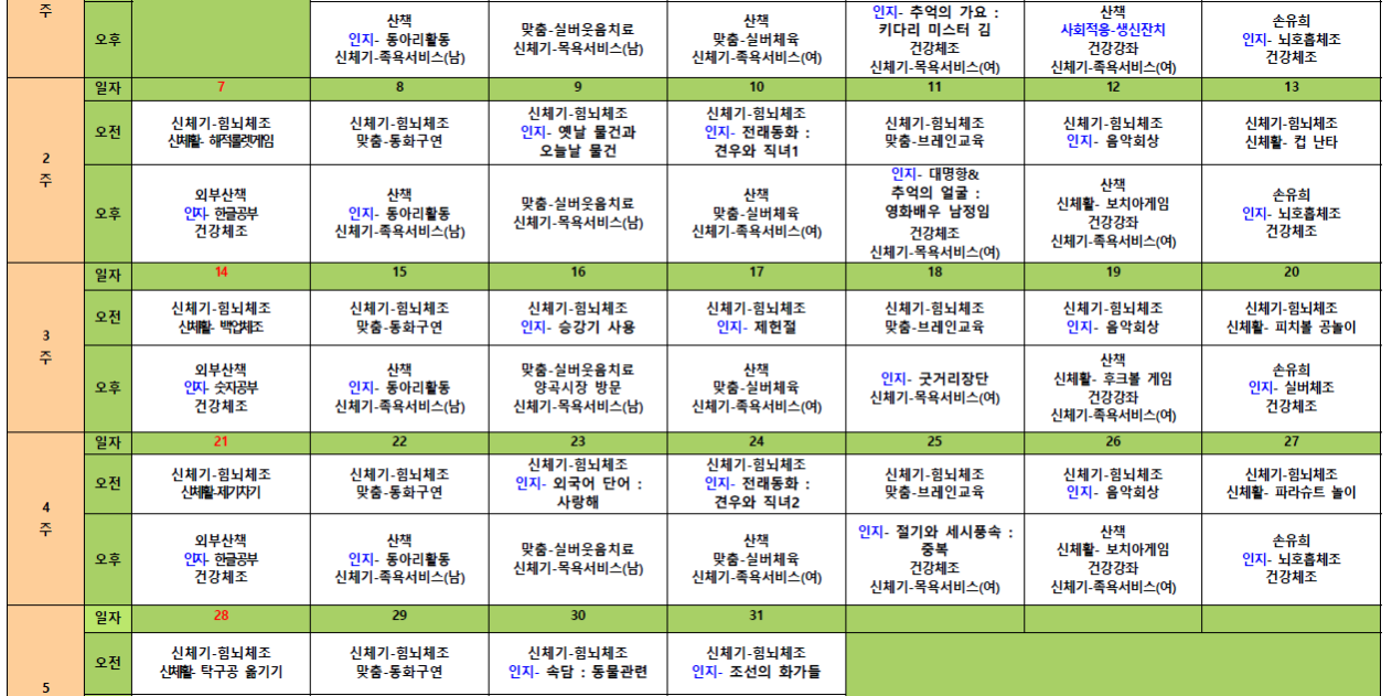 7월242024프로그램 일정표2024년 07월 24일Post navigationPreviousPrevious post:사회적응-생신잔치NextNext post:김포효사랑주야간센터 7월 식단표 및 간식 식단입니다.Related Posts김포효사랑주야간보호센터 10월 월간프로그램계획입니다.2025년 10월 03일김포효사랑주야간보호센터 9월 월간프로그램계획입니다.2025년 09월 11일김포효사랑주야간보호센터 8월 월간프로그램계획입니다.2025년 08월 05일김포효사랑주야간보호센터 7월 월간프로그램계획입니다.2025년 07월 28일김포효사랑주야간보호 6월간 프로그램계획입니다.2025년 06월 06일김포효사랑주야간보호 5월간 프로그램계획입니다.2025년 05월 22일