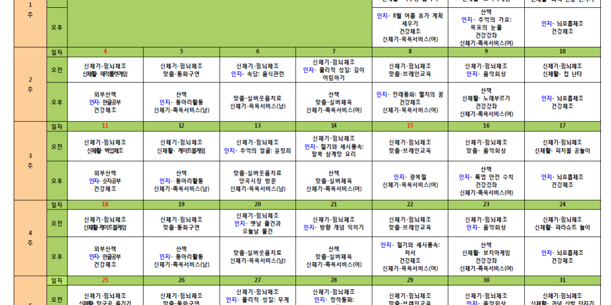 8월22024프로그램 일정표2024년 08월 02일Post navigationPreviousPrevious post:김포효사랑주야간센터 7월 식단표 및 간식 식단입니다.NextNext post:김포효사랑주야간센터 8월 식단표 및 간식 식단입니다.Related Posts김포효사랑주야간보호센터 10월 월간프로그램계획입니다.2025년 10월 03일김포효사랑주야간보호센터 9월 월간프로그램계획입니다.2025년 09월 11일김포효사랑주야간보호센터 8월 월간프로그램계획입니다.2025년 08월 05일김포효사랑주야간보호센터 7월 월간프로그램계획입니다.2025년 07월 28일김포효사랑주야간보호 6월간 프로그램계획입니다.2025년 06월 06일김포효사랑주야간보호 5월간 프로그램계획입니다.2025년 05월 22일