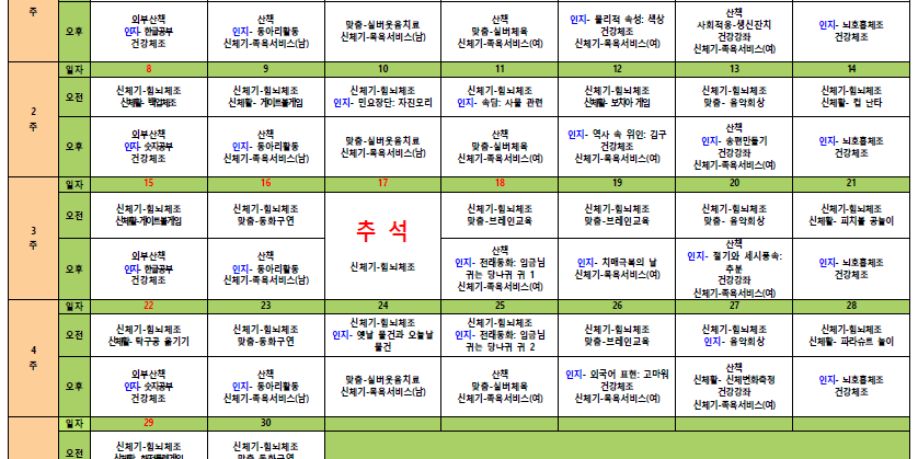 9월32024프로그램 일정표2024년 09월 03일Post navigationPreviousPrevious post:맞춤프로그램-실버웃음치료NextNext post:김포효사랑주야간센터 9월 식단표 및 간식 식단입니다.Related Posts김포효사랑주야간보호센터 10월 월간프로그램계획입니다.2025년 10월 03일김포효사랑주야간보호센터 9월 월간프로그램계획입니다.2025년 09월 11일김포효사랑주야간보호센터 8월 월간프로그램계획입니다.2025년 08월 05일김포효사랑주야간보호센터 7월 월간프로그램계획입니다.2025년 07월 28일김포효사랑주야간보호 6월간 프로그램계획입니다.2025년 06월 06일김포효사랑주야간보호 5월간 프로그램계획입니다.2025년 05월 22일