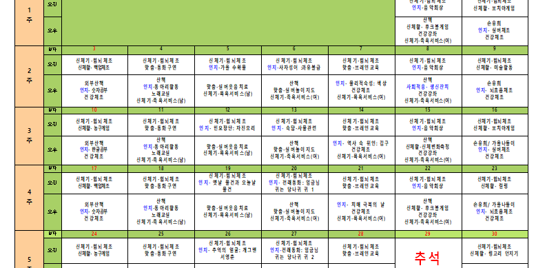 9월232023프로그램 일정표 2023년 09월 23일Post navigationPreviousPrevious post:인지프로그램-뇌호흡체조NextNext post:맞춤프로그램-실버웃음치료Related Posts김포효사랑주야간보호센터 10월 월간프로그램계획입니다.2025년 10월 03일김포효사랑주야간보호센터 9월 월간프로그램계획입니다.2025년 09월 11일김포효사랑주야간보호센터 8월 월간프로그램계획입니다.2025년 08월 05일김포효사랑주야간보호센터 7월 월간프로그램계획입니다.2025년 07월 28일김포효사랑주야간보호 6월간 프로그램계획입니다.2025년 06월 06일김포효사랑주야간보호 5월간 프로그램계획입니다.2025년 05월 22일