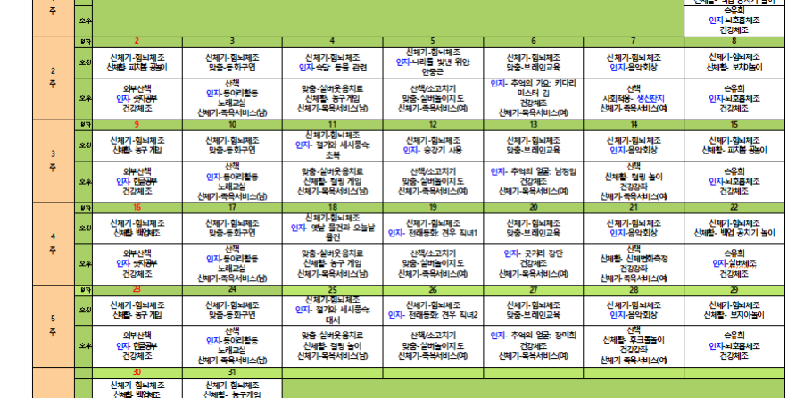 7월42023미분류프로그램 일정표 2023년 07월 04일Post navigationPreviousPrevious post:인지프로그램-뇌호흡체조NextNext post:김포효사랑 주야간센터 7월 식단표 및 간식 식단입니다.Related Posts김포효사랑주야간보호센터 10월 월간프로그램계획입니다.2025년 10월 03일김포효사랑주야간보호센터 9월 월간프로그램계획입니다.2025년 09월 11일김포효사랑주야간보호센터 8월 월간프로그램계획입니다.2025년 08월 05일김포효사랑주야간보호센터 7월 월간프로그램계획입니다.2025년 07월 28일김포효사랑주야간보호 6월간 프로그램계획입니다.2025년 06월 06일김포효사랑주야간보호 5월간 프로그램계획입니다.2025년 05월 22일