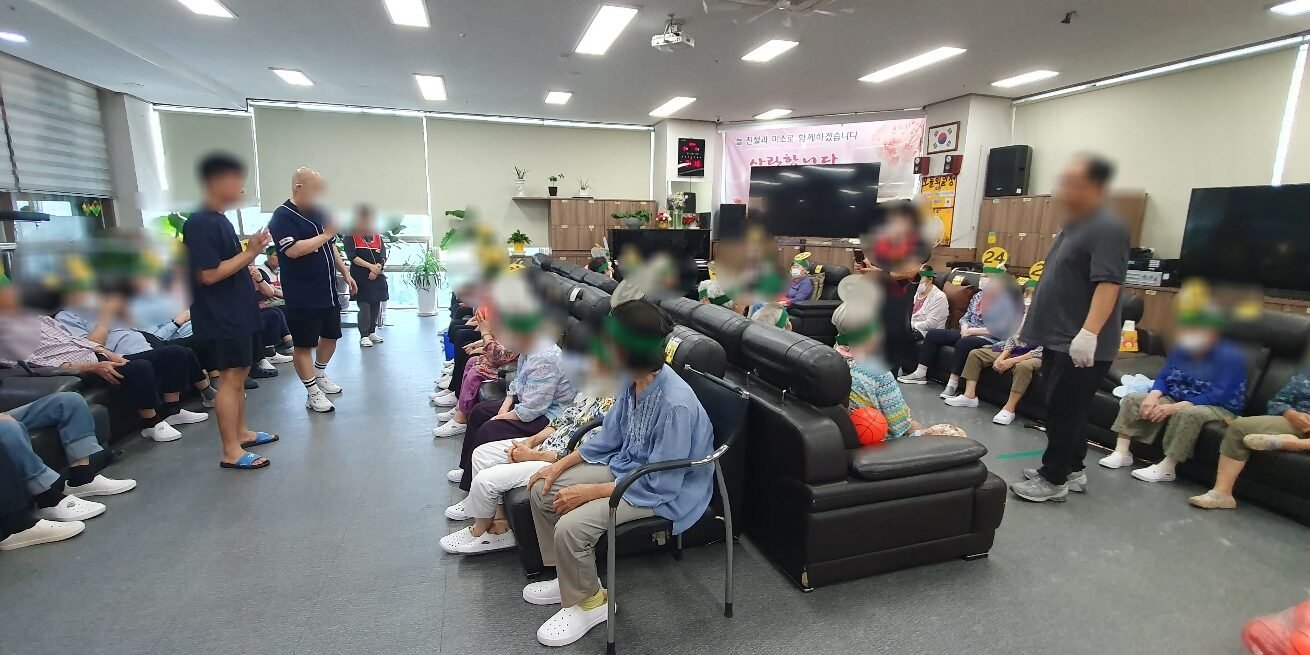 동료 어르신 이마에 번호를 말하시며 공을 던지시며