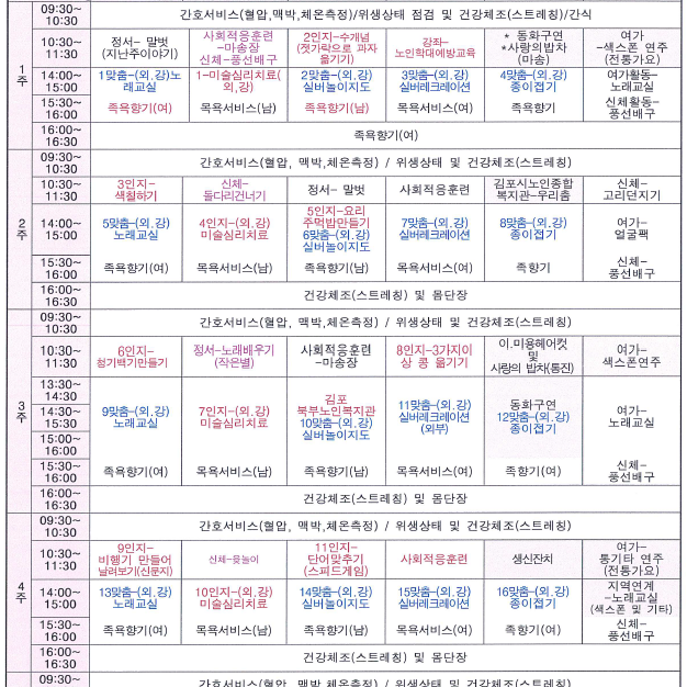 김포효사랑주야간보호센터는 노인장기요양보험법에 의하여 고령이나 치매 중풍 등 노인성 질환으로 고생하시는 어르신들의 ‘건강과 행복한 노후’를 지원하고, 어르신을 수발하는 가족들에게 조그만 ‘힘’이 되어드리고자 합니다.