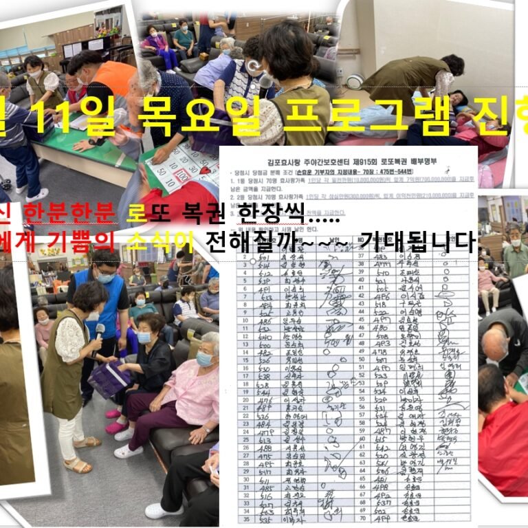 6월 11일 목요일 프로그램프로그램참여 앨범By gimpohyo2020년 06월 16일한 주간의 희망을 ~~~~ 로또복권을 한 분당 한 장씩 추첨을 통햐 나누어 드리고 이번로 토요일 복권 당첨을 기대하며… Details