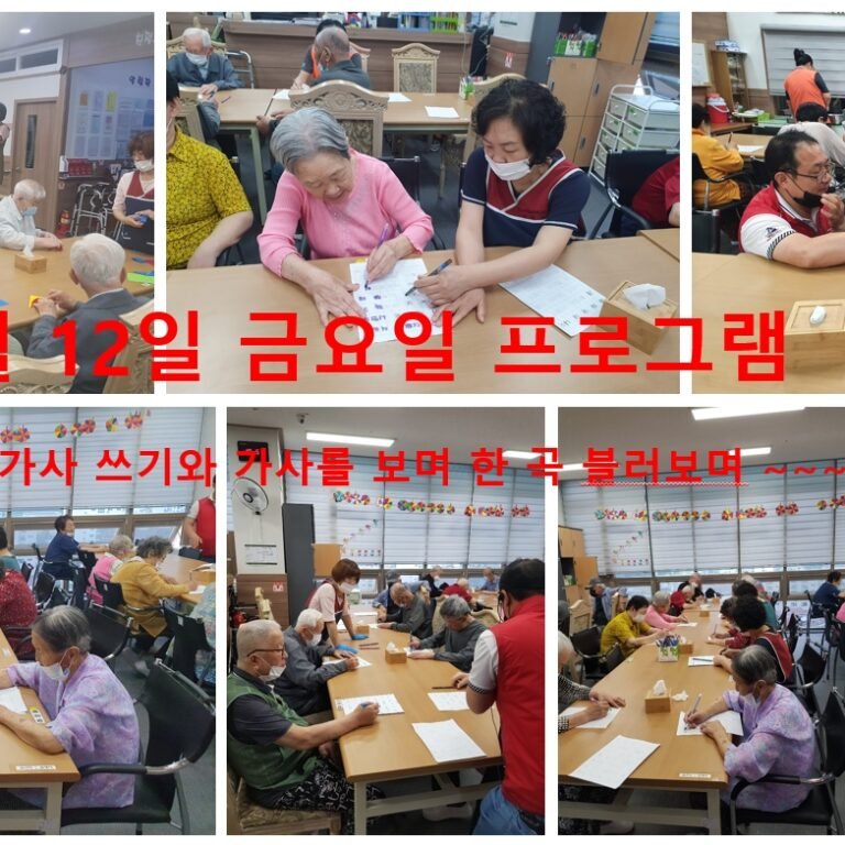 6월 12일 금요일 프로그램프로그램참여 앨범By gimpohyo2020년 06월 16일한글 쓰기로 “내나이가 어때서 ~~ ” 노래 가사를 써보시고 한 곡조 불러 보시며 즐거운 시간으로 보내싶니다 Details