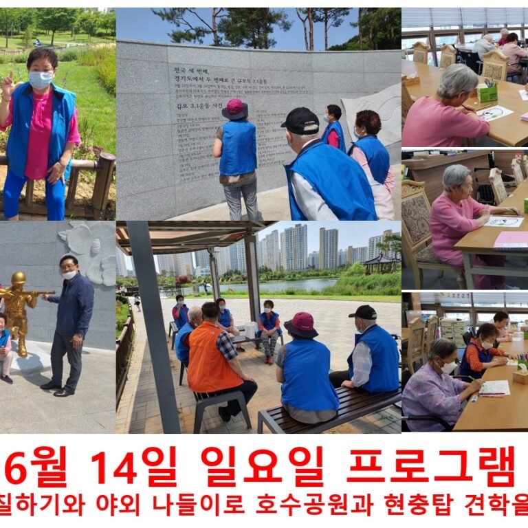 6월 14일 일요일 프로그램 현황프로그램참여 앨범By gimpohyo2020년 06월 16일화창한 날씨 답답한 내부를 벗어나 오랜만에 나들이로 호수공원과 현충원을 견학하시며 시원한 주말을 보내싶니다. Details