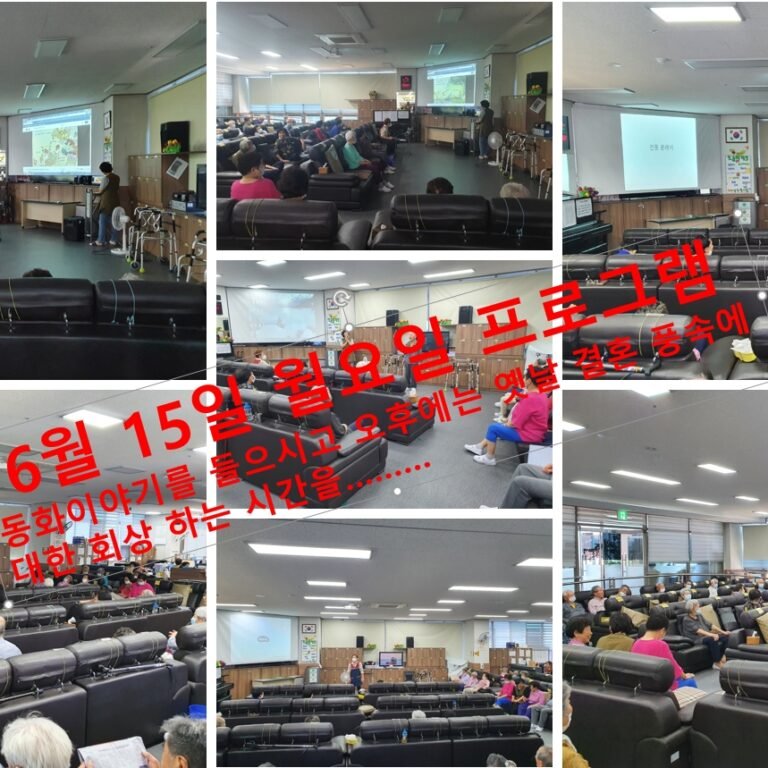 6월 15일 월요일 프로그램프로그램참여 앨범By gimpohyo2020년 06월 16일동화 이야기”나쁜 풍습을 없앤 어머니의 지혜”,”바위를 치운 꽤돌이와 힘돌이” 이야기를 보시고 오후에는 추억의 정통혼례에 대한 이야기를 하시며 추억을… Details