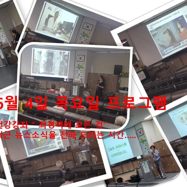 목요일 프로그램으로 건강강좌와 시사뉴스를 진행했습니다. 건강강좌를 통해 자신의 건강 사항을 확인 할 수 있는 시간을 가지시고 최근 뉴스를…