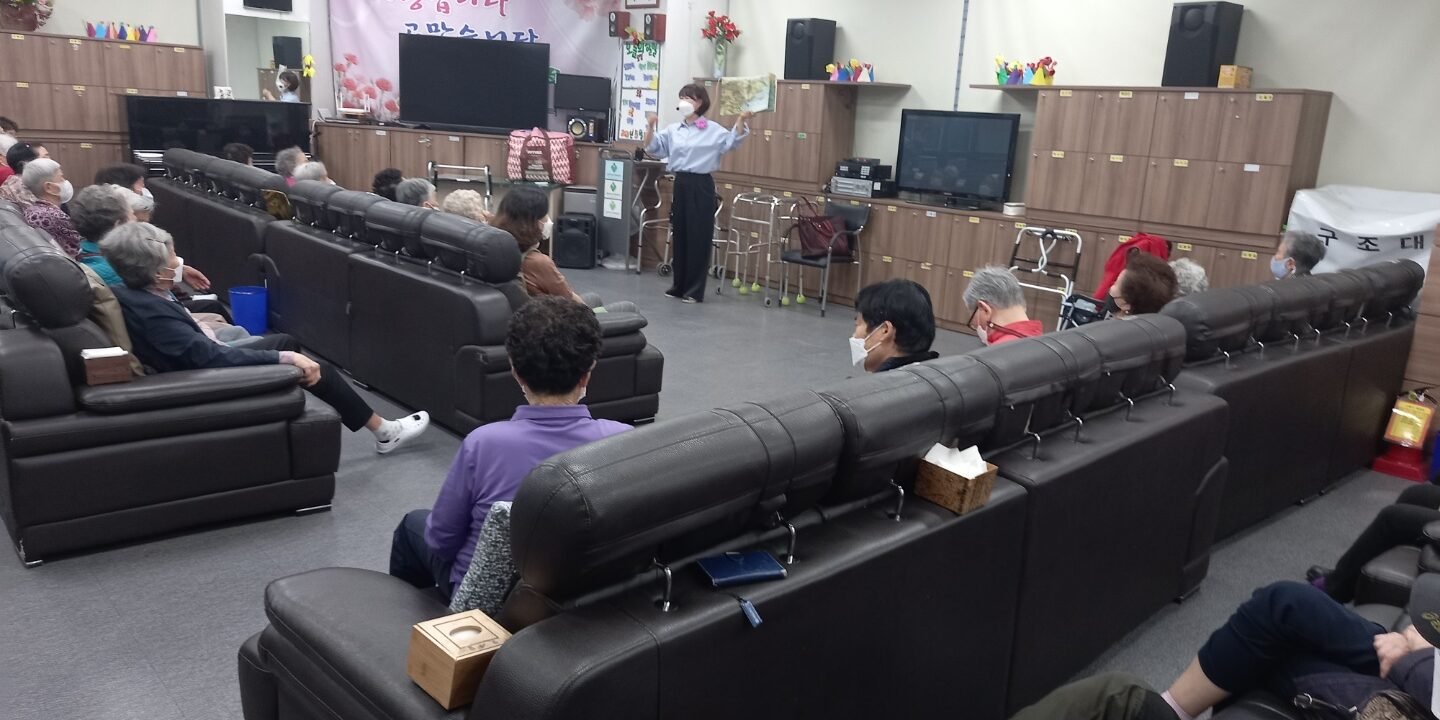 우리 어르신들 옛 동화 이야기를 활기찬 목소리로 이야기를 들으시고 재미있는 이야기 부분에서는 맘껏 웃으시며 엔돌핀의 분비촉진하여 건강한 뇌를 만들고 긍정적인 생활습관을 만듭니다.