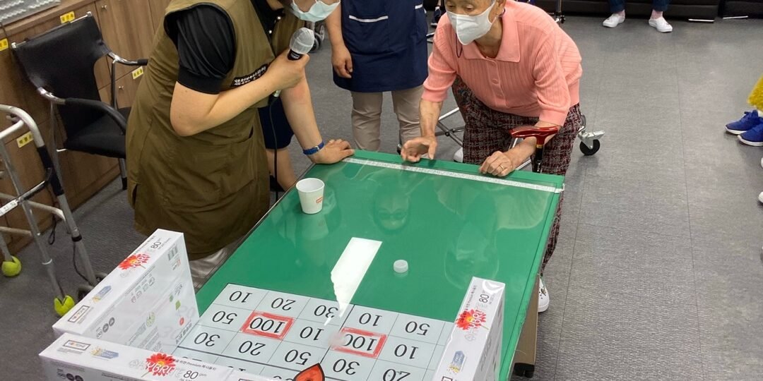 6월262021프로그램참여 앨범★ 병뚜껑게임 ★병 뚜껑을 목표 점수를 향해 힘껏 날리며 손의 힘, 강약 조절을 통해 소근육 운동을 했다. 거리를 재며 한 두번 던져보니 손에 익는다며 재밌게 참여하셨다. 병 뚜껑이 도중에 떨어지지 않고 정확한 위치에 안착시킬 수 있도록 집중력을 발휘하셨다.점수별로 시상을 하니 성취감도 느끼시고 자존감도 상승시키며 즐거운 시간을 보냈다. 2021년 06월 26일Post navigationPreviousPrevious post:2021년 6월 23일 수요일 프로그램 현황NextNext post:2021년 6월 25일 금요일 프로그램 현황Related Posts김포문화재단-공연행사2025년 10월 24일사회적응-생신잔치2025년 09월 08일사회적응- 현충탑 방문2025년 06월 06일사회적응-생신잔치2025년 03월 08일맞춤프로그램- 실버웃음치료2025년 02월 18일신체활동- 김장김치 담그기2024년 11월 15일