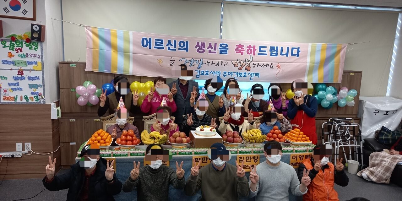 1월72022프로그램참여 앨범2022년 1월 7일 금요일 생신잔치 현황입니다.★ 생신잔치 ★김포효사랑 주인주간보호센터는 1월 7일(금) 1월 어르신 생신잔치를 실시하였습니다.김호성원장님께서 인사말씀을 하셨습니다.케익에 촛불을 붙이고 원장님과 이사님과 선생님들께서 생신축하송을 불러드렸습니다.축하송이 끝난후에는 어르신들께서 모여서 촛불을 꺼주셨습니다.케익의 촛불을 끈 후 어르신들께서 원장님과 케익 컷팅식을 가졌습니다.컷팅식이 끝이 나고 어르신들께 만수무강을 기원하면서 선생님들께서 큰절을 올렸습니다.생신을 맞이하신 어르신들께 선생님의 편지를 읽는 시간을 가졌습니다.이후 생신을 맞으신 어르신들의 인사말씀이 있으셨습니다.김진숙 ,최인희 어르신께서 축하말씀을 해주셨습니다.생신을 맞이하신 어르신들과 함께 전직원 기념사진을 찍었습니다.2부 순서로 김애자 선생님께서 축하공연을 진행하셨습니다. 생신을 맞이하신 어르신께서도 노래를 부르셨습니다.특히 어르신들은 선생님들의 공연을 관람하며 흐뭇한 미소로 만족감을 보이셨고, 다양한 게임으로 구성된 레크리에이션을 통해 어르신들의 활기와 적극적인 모습을 볼 수 있었습니다.1월 생신을 맞이하신 박복서, 조태순, 박만영, 김만향, 이영복 어르신~ 생신 진심으로 축하드리고 건강하고 행복하세요♥ 2022년 01월 07일Post navigationPreviousPrevious post:김포효사랑 주야간센터 1월 월간 프로그램 계획입니다NextNext post:2022년 1월 12일 수요일 프로그램 현황입니다.Related Posts김포문화재단-공연행사2025년 10월 24일사회적응-생신잔치2025년 09월 08일사회적응- 현충탑 방문2025년 06월 06일사회적응-생신잔치2025년 03월 08일맞춤프로그램- 실버웃음치료2025년 02월 18일신체활동- 김장김치 담그기2024년 11월 15일