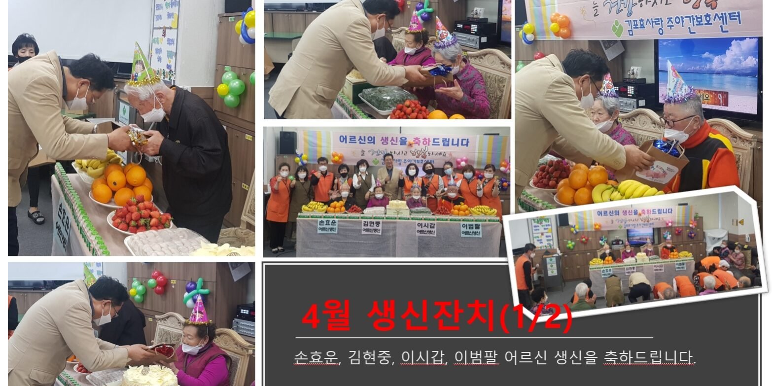 4월252020프로그램참여 앨범4월 생신을 맞이하신 손효운, 김현중, 이시갑, 이범팔 어르신들 생신을 축하드리고 모든 분들의 축하공연을 펼쳐 드렸습니다.모두가 즐거운 시간을 보내셨습니다. 2020년 04월 25일Post navigationPreviousPrevious post:4월23일 목요일 프로그램 진행 사진NextNext post:4월 25일 토요일 자유프로그램 활동 현황입니다.Related Posts김포문화재단-공연행사2025년 10월 24일사회적응-생신잔치2025년 09월 08일사회적응- 현충탑 방문2025년 06월 06일사회적응-생신잔치2025년 03월 08일맞춤프로그램- 실버웃음치료2025년 02월 18일신체활동- 김장김치 담그기2024년 11월 15일