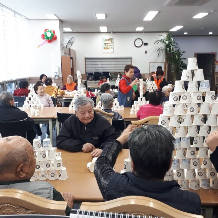2019.01.09.수요일 컵쌓기놀이를 했습니다. 조심∼조심∼ 쌓아올린 종이컵이 무너질땐 어르신들의 애간장도 무너지네요 ≈≈ ㅋㅋ