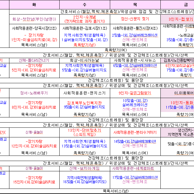 김포효사랑주야간보호센터는 노인장기요양보험법에 의하여 고령이나 치매 중풍 등 노인성 질환으로 고생하시는 어르신들의 ‘건강과 행복한 노후’를 지원하고, 어르신을 수발하는 가족들에게 조그만 ‘힘’이 되어드리고자 합니다.