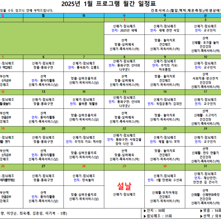 김포효사랑주야간보호 1월간 프로그램계획입니다.