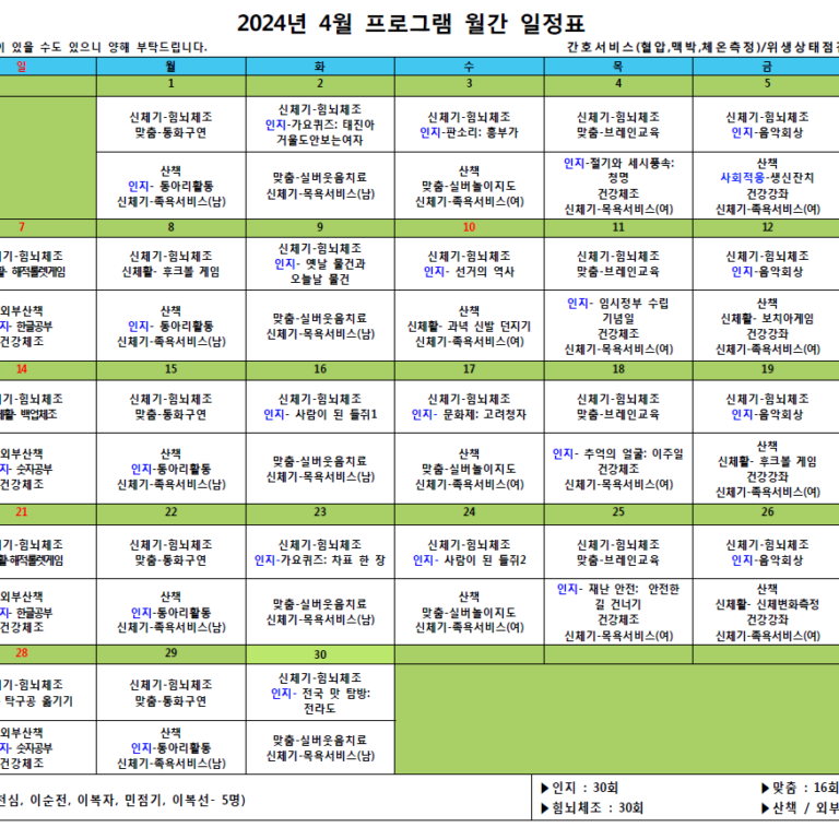 김포효사랑주야간보호 4월간 프로그램 계획입니다.