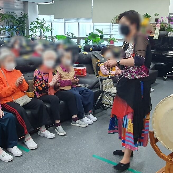 안녕하세요~ 김포효사랑주야간보호센터입니다. 맞춤프로그램-실버웃음치료 오늘 수업은 웃음치료 강사님 따라서 어르신께서 “하하호호” 큰소리로 따라 웃으시며 ‘찔레꽃, 아리랑’ 노래를 부르시며…