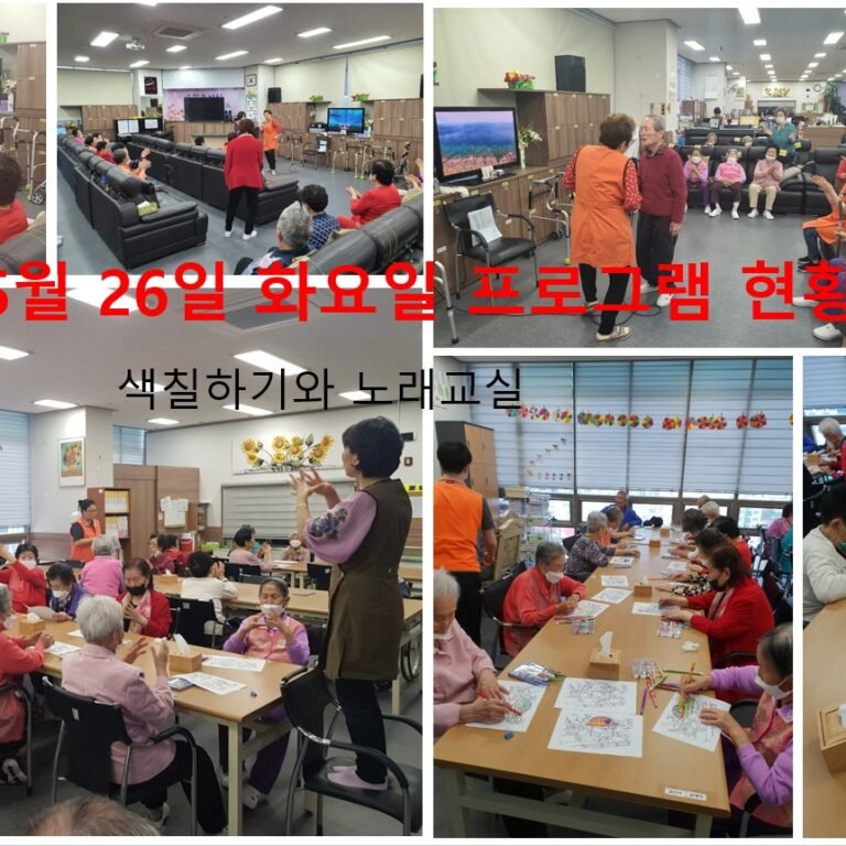화요일 프로그램으로 오전에는 귀여운 그림을 아름답게 색을 칠하는 색칠하기를 오후에는 본인이 좋아 하거나 배우고 싶었던 노래를 배우고 같이…