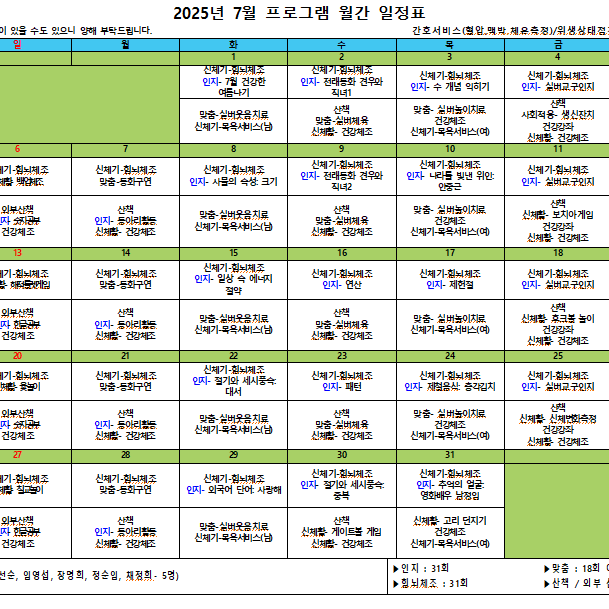 김포효사랑주야간보호센터 7월 월간프로그램계획입니다.