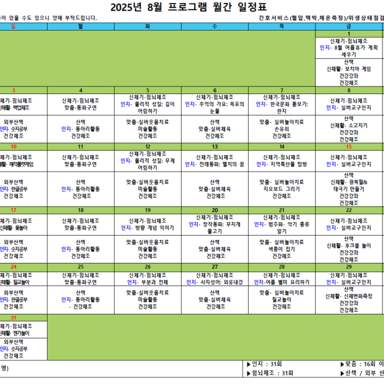 김포효사랑주야간보호센터 8월 월간프로그램계획입니다.