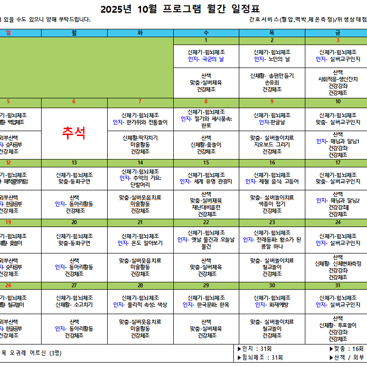 김포효사랑주야간보호센터 10월 월간프로그램계획입니다.